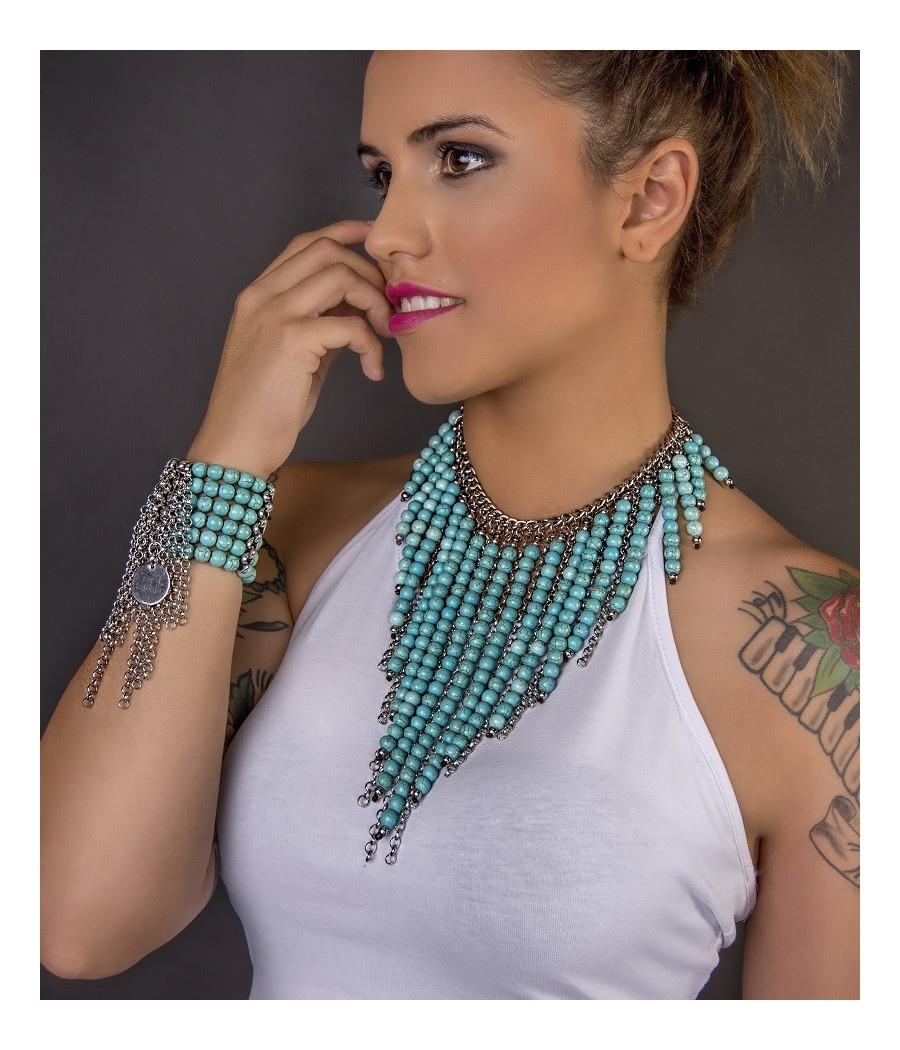 Atrevido y llamativo collar, realizado con piedras naturales de Turquesa y Acero inoxidable. El fresco color de esta gema resalta tu belleza en cualquier ocasión.