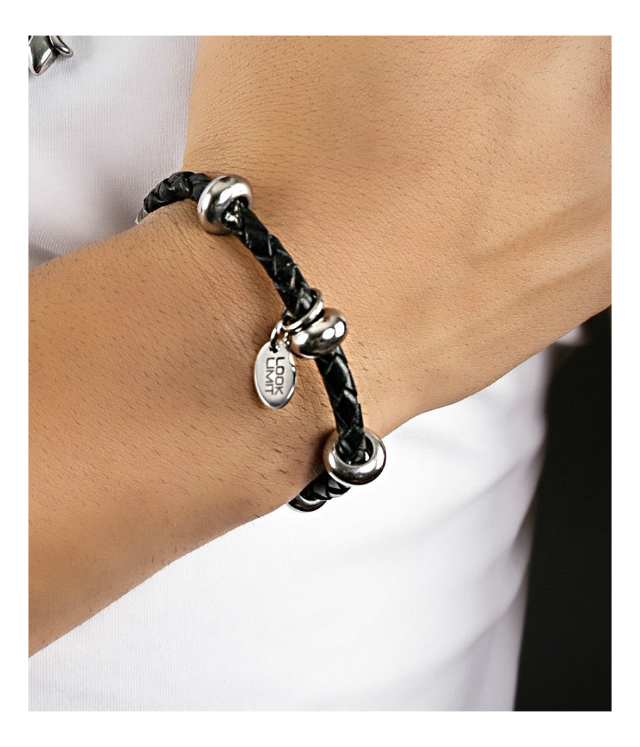 Moderna pulsera realizada con cuero trenzado negro y adornos de Acero Inoxidable de máxima calidad. Combínala con el resto de pulseras MANHATTAN COLLECTION para conseguir un look único.