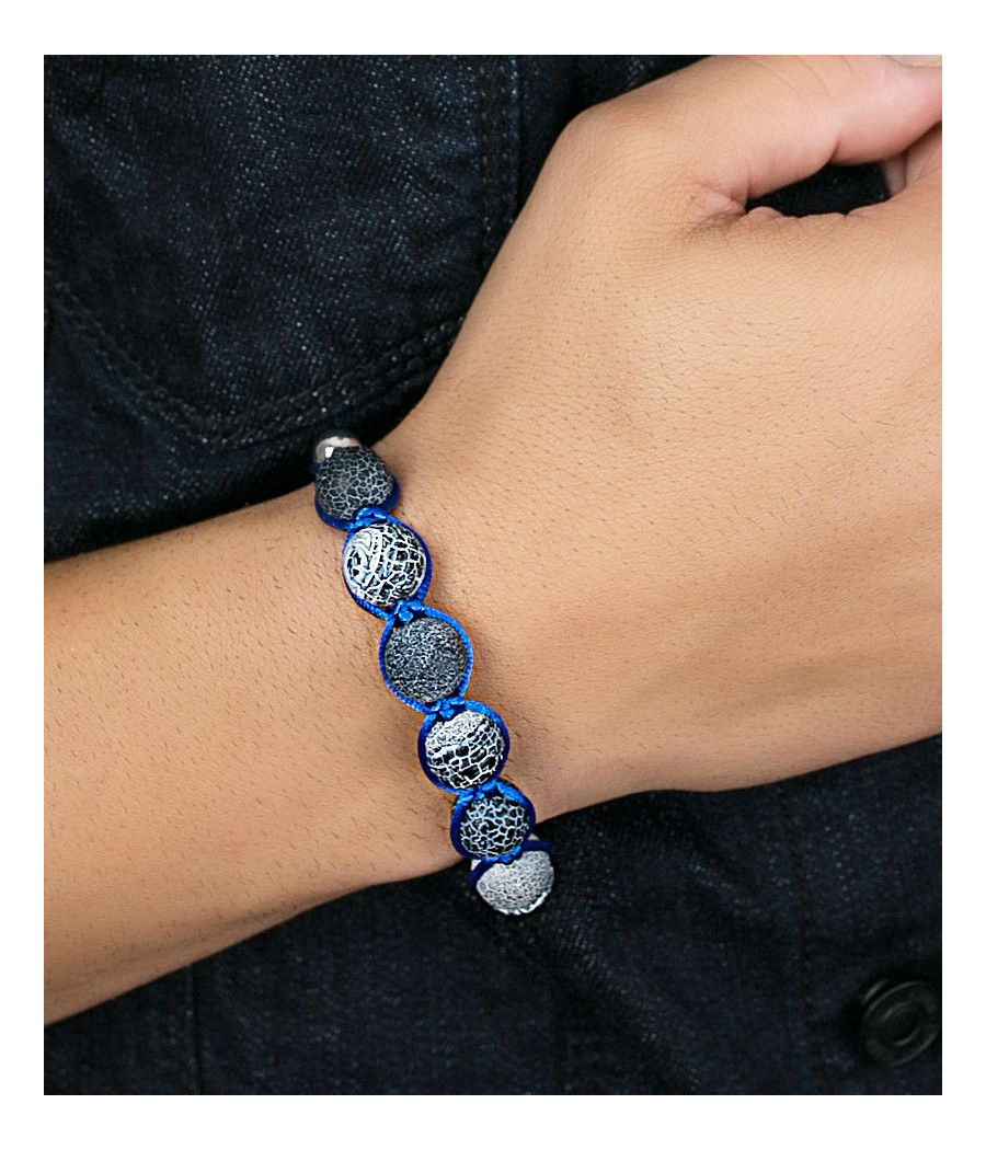 Moderna y elegante pulsera estilo Shamballa de piedras naturales de Ónix y Magnesita azul con una pieza central grabada de plata envejecida. Un diseño que te aportará un estilo único. Combínala con el resto de pulseras MANHATTAN para conseguir un estilo extremado.